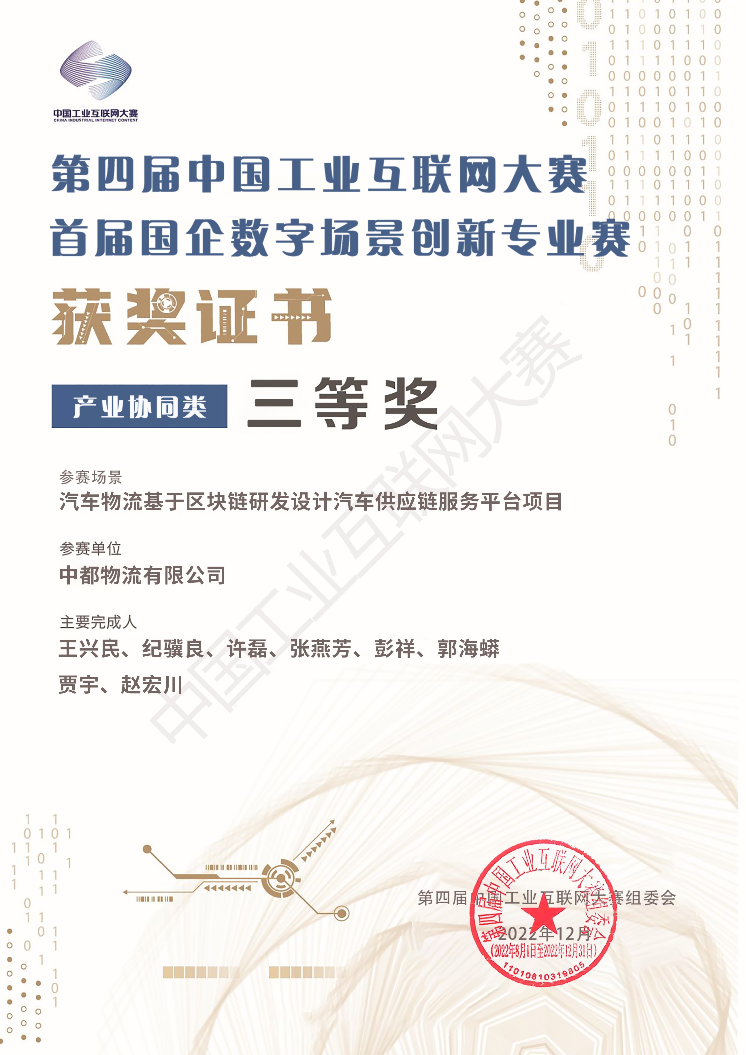 近日,由國務(wù)院國資委、工業(yè)和信息化部、中華全國工商業(yè)聯(lián)合會(huì)、浙江省人民政府聯(lián)合主辦的第四屆中國工業(yè)互聯(lián)網(wǎng)大賽結(jié)果正式揭曉,中都物流有限公司提報(bào)的“汽車物流基于區(qū)塊鏈研發(fā)設(shè)計(jì)汽車供應(yīng)鏈服務(wù)平臺(tái)”項(xiàng)目在國企數(shù)字場景創(chuàng)新專業(yè)賽中斬獲三等獎(jiǎng)。