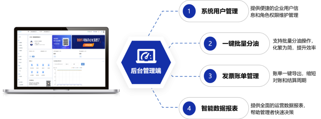 管理者可使用管理后臺,完成用戶信息維護、一鍵分油、結(jié)算對賬和數(shù)據(jù)監(jiān)控分析等精益化管理動作。